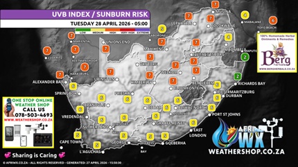 The UV Index will remain highest between 11:00 and 15:00 - Please take the necessary precautions when going out in the sun or having outside activities during days with high UV Indexes. Rehydrate frequently to avoid dehydration. DO NOT use alcohol as a way of hydration, Alcohol have an opposite effect and in fact contribute to dehydration.